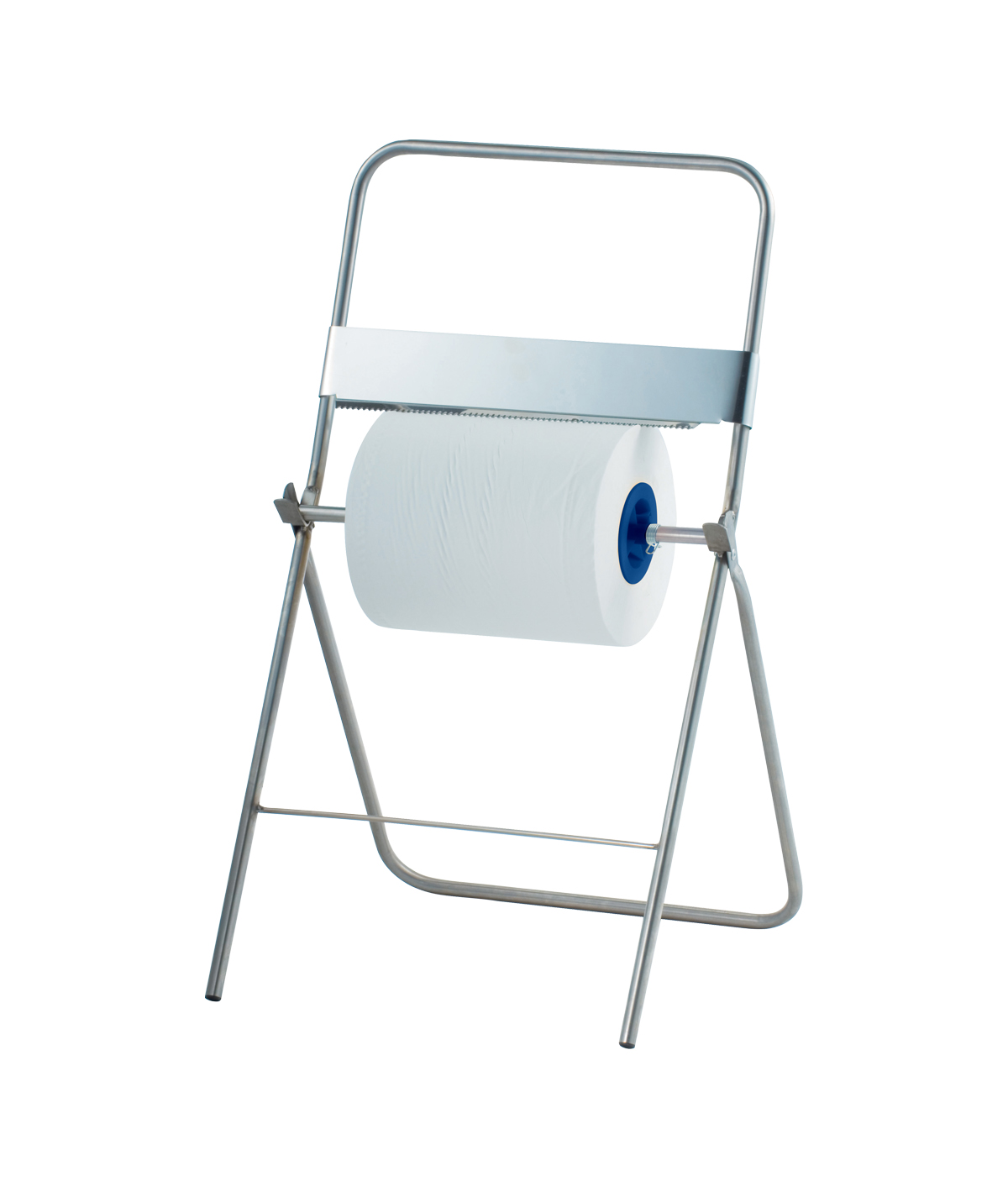 Der Bodenständer für Industrierollen aus hochwertigem Edelstahl 18/10 (Aisi 304) sorgt für Beständigkeit und Stabilität. Mit der oberen Bügelsäge ermöglicht es ein effektives und verschwenderisches Zerreißen des Papiers.